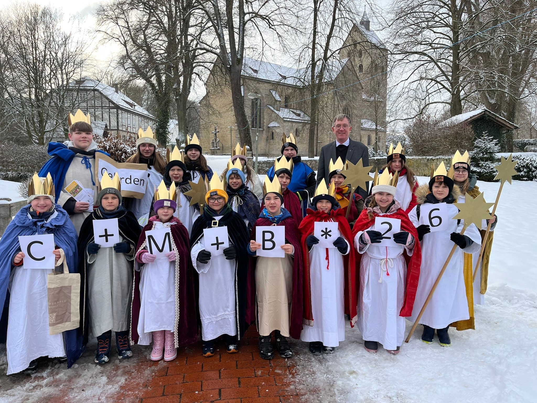 Motovierte Sternsinger aus Gehrden zeigen hier zusammen mit Pastor Stock den Segen für 2026: Christus + Mansionem + Benedicat
